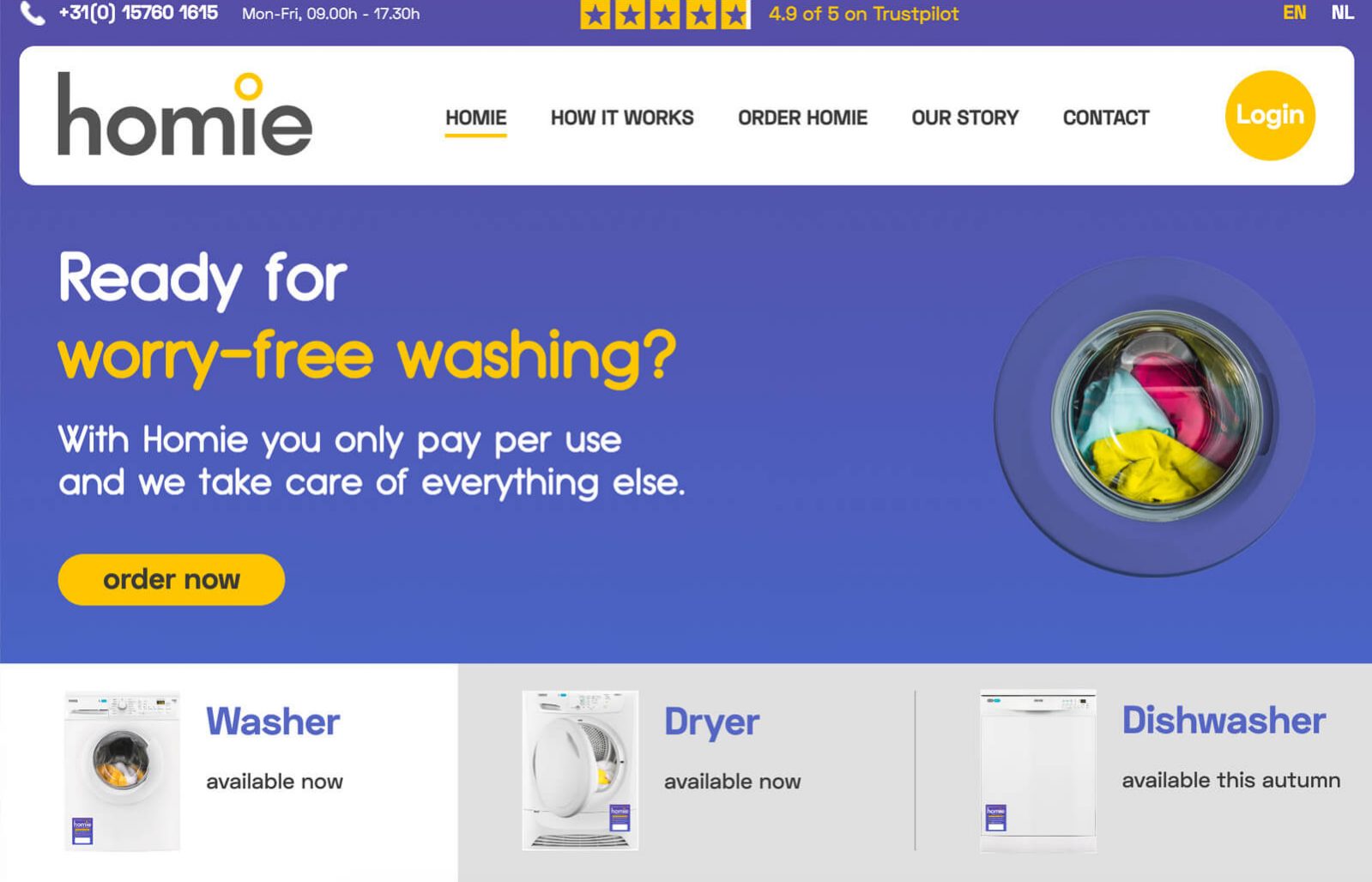 Voor Homie Pay Per Use hebben we de complete bouw op ons mogen nemen. Dankzij een aantal custom features (zoals de wasmachine calculator) hebben we iets moois neergezet dat voldoet aan gebruiksgemak. Niet alleen een tevreden klant, maar ook tevreden bezoekers.